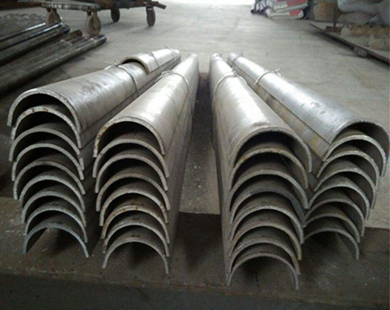 耐磨磚的斷面形狀大多為半圓形(180度) ,也有120-160度,主要用于帶翅片的管子(水墻) ; 耐磨磚分為直型耐磨磚、內(nèi)彎耐磨磚、外彎耐磨磚、側(cè)彎耐磨磚、 S 彎耐磨磚等。直紋抗磨瓦長(zhǎng)度在20mm-3000mm 范圍內(nèi),一般長(zhǎng)度1000-2000mm 較為常用,并且在繪圖上參數(shù)如下: 所用管道外徑、所用管道彎曲半徑 r (到管道中心)、彎曲角度和耐磨瓦兩側(cè)弧形直截面長(zhǎng)度。