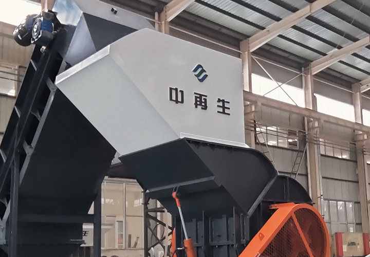 破碎線主機殼體采用特厚鋼板制造,內襯為高錳鑄鋼件,可更換;主機轉子盤安裝于水平軸上,轉子盤圓周分布有銷軸,軸向懸有錘頭;主軸用滾珠軸承支撐,循環油強制潤滑冷卻,并裝有溫度傳感器;進料口裝有液壓輥筒喂料裝置,位置一高一低,同向旋轉,能將大件松散物料壓扁,送入破碎腔內。