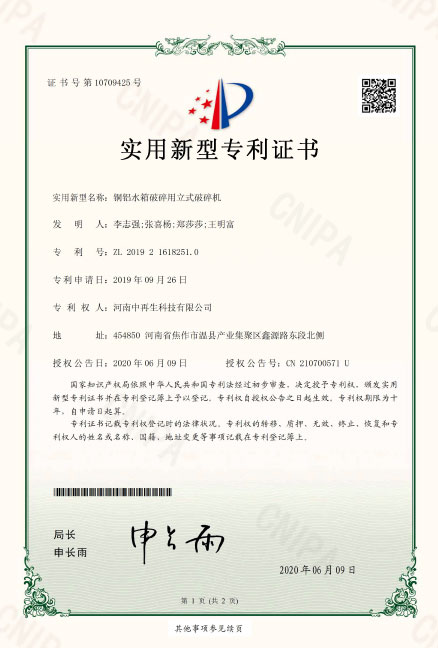 • ZL2019216182510銅鋁水箱破碎用立式破碎機