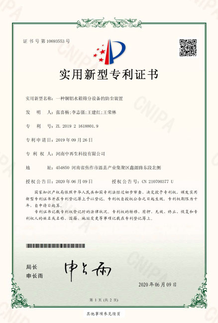 • ZL2019216188019一種銅鋁水箱篩分設備的防塵裝置