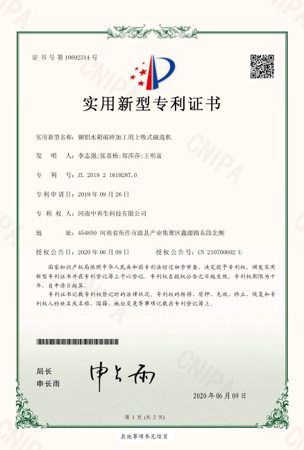 • ZL2019216192870銅鋁水箱破碎加工用上吸式磁選機